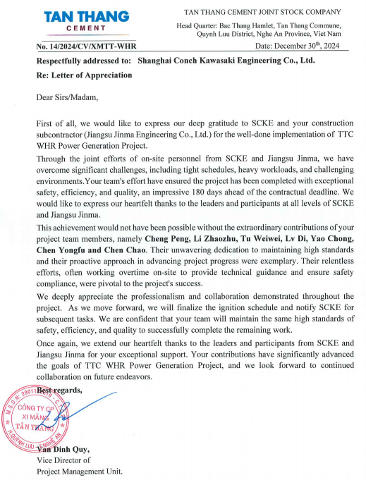 越南項(xiàng)目業(yè)主向海川工程公司發(fā)來感謝信