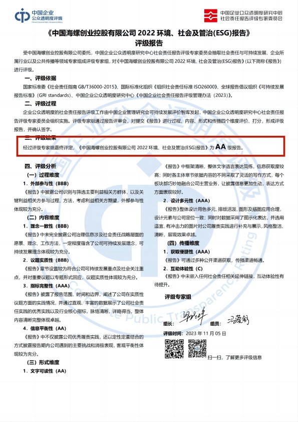 近日,第六屆中國(guó)國(guó)際進(jìn)口博覽會(huì)在上海舉行。作為博覽會(huì)的配套活動(dòng),工業(yè)和信息化部、司法部等有關(guān)部門聯(lián)合主辦了“法治護(hù)航制造業(yè)高質(zhì)量可持續(xù)發(fā)展國(guó)際論壇",并在會(huì)上集中發(fā)布了“2023工信千家優(yōu)秀企業(yè)社會(huì)責(zé)任報(bào)告”,《中國(guó)海螺創(chuàng)業(yè)控股有限公司2022環(huán)境、社會(huì)及管治(ESG)報(bào)告》成功入選并獲評(píng)信用評(píng)級(jí)AA級(jí),為此次報(bào)告評(píng)級(jí)體系九個(gè)等級(jí)中的第二等級(jí)!