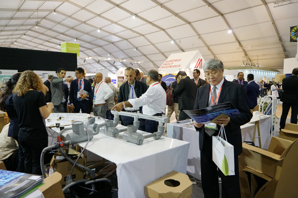 ??? 11月8日上午,在摩中商會、摩洛哥外貿(mào)銀行、香港匯盛資本等機構(gòu)負責人的陪同下,紀勤應(yīng)總經(jīng)理一行參觀了聯(lián)合氣候大會主展館。展會現(xiàn)場來自世界各地節(jié)能環(huán)保產(chǎn)業(yè)技術(shù)展示、部分獨具匠心的展臺設(shè)計展現(xiàn)出的世界各國實現(xiàn)綠色循環(huán)低碳發(fā)展,推進清潔能源、可再生資源,應(yīng)對氣候變化、追求美好未來的決心等給考察團一行留下了深刻的印象。