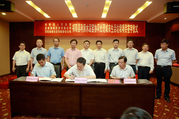 ? ? 2014年6月8日上午,湖南省祁陽縣人民政府、蕪湖海螺投資有限公司及祁陽海螺水泥有限責(zé)任公司在祁陽縣正式簽署了《關(guān)于祁陽縣利用水泥窯協(xié)同處理城市生活垃圾項(xiàng)目合作協(xié)議》,祁陽縣縣委書記魏湘江,縣長周新輝,公司總經(jīng)理紀(jì)勤應(yīng),副總經(jīng)理李大明,祁陽海螺總經(jīng)理陳小兵等參加了簽約儀式。