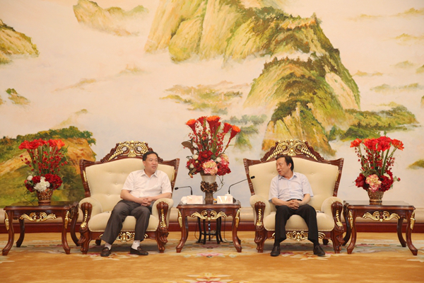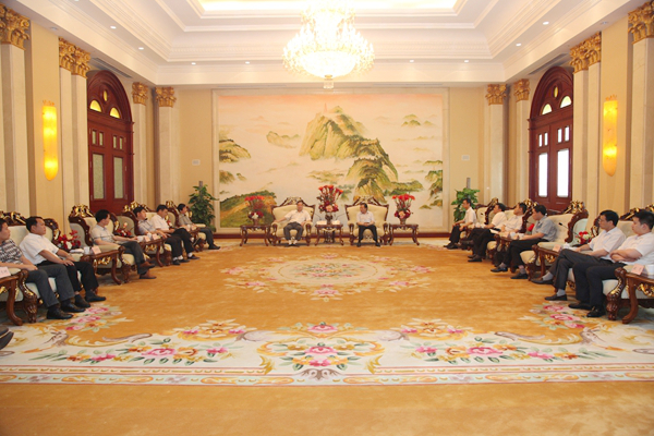? ? 簽字儀式前,紀(jì)勤應(yīng)總經(jīng)理在海螺國(guó)際會(huì)議中心海螺廳會(huì)見(jiàn)楊維縣長(zhǎng)一行。