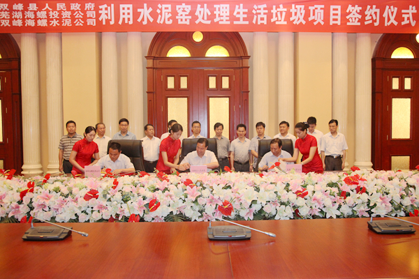 ? ? 2014年6月29日上午,雙峰縣人民政府、蕪湖海螺投資公司、雙峰海螺公司在蕪湖海螺國(guó)際會(huì)議中心東海廳正式簽署了《關(guān)于雙峰縣利用水泥窯協(xié)同處理城市生活垃圾項(xiàng)目合作協(xié)議》,雙峰縣縣長(zhǎng)楊維,縣委常委、副縣長(zhǎng)龍燕青,縣人大常委會(huì)副主任李仲喬;海螺創(chuàng)業(yè)總經(jīng)理紀(jì)勤應(yīng)、副總經(jīng)理李大明;雙峰海螺副總經(jīng)理萬(wàn)天靜等參加了簽約儀式。
